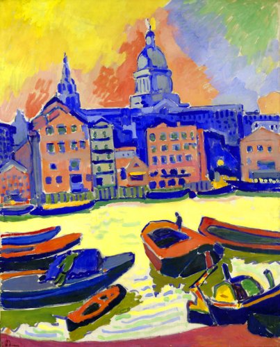 The image is a 1906 painting by Andre Derain. Andre Derain was called a Fauvist, which translates as "wild beast", for his ferocious disregard of the sobreity of real-world colors.